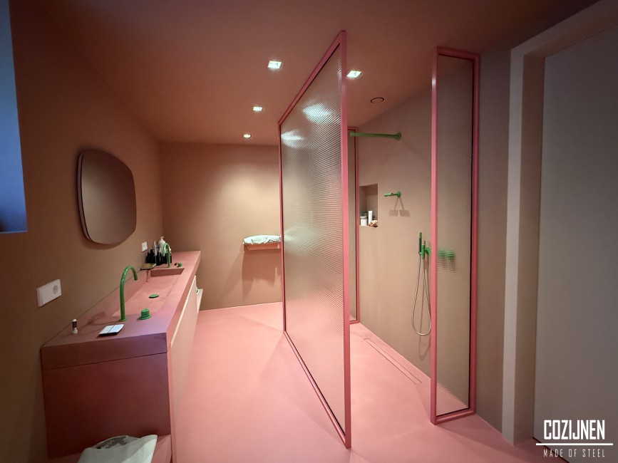De stalen doucheschermen in mat roze poedercoating geven de ruimte een speelse maar tegelijk elegante uitstraling. Het zachte roze contrasteert prachtig met de kleurrijke elementen in de badkamer en maakt van de douche een stijlvol statement. Het draadglas zorgt voor een subtiele gloed en een vleugje mysterie: voldoende privacy tijdens het douchen, terwijl licht en ruimte behouden blijven. Het resultaat is een badkamer waar functionaliteit samensmelt met creativiteit – een plek die elke dag een vleugje luxe en eigenheid toevoegt.