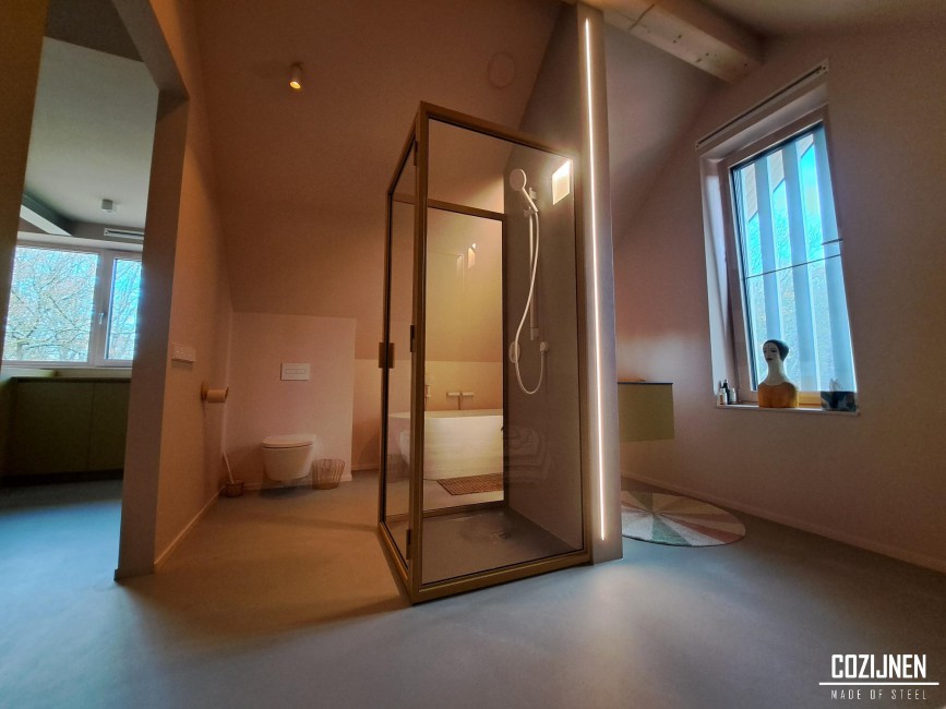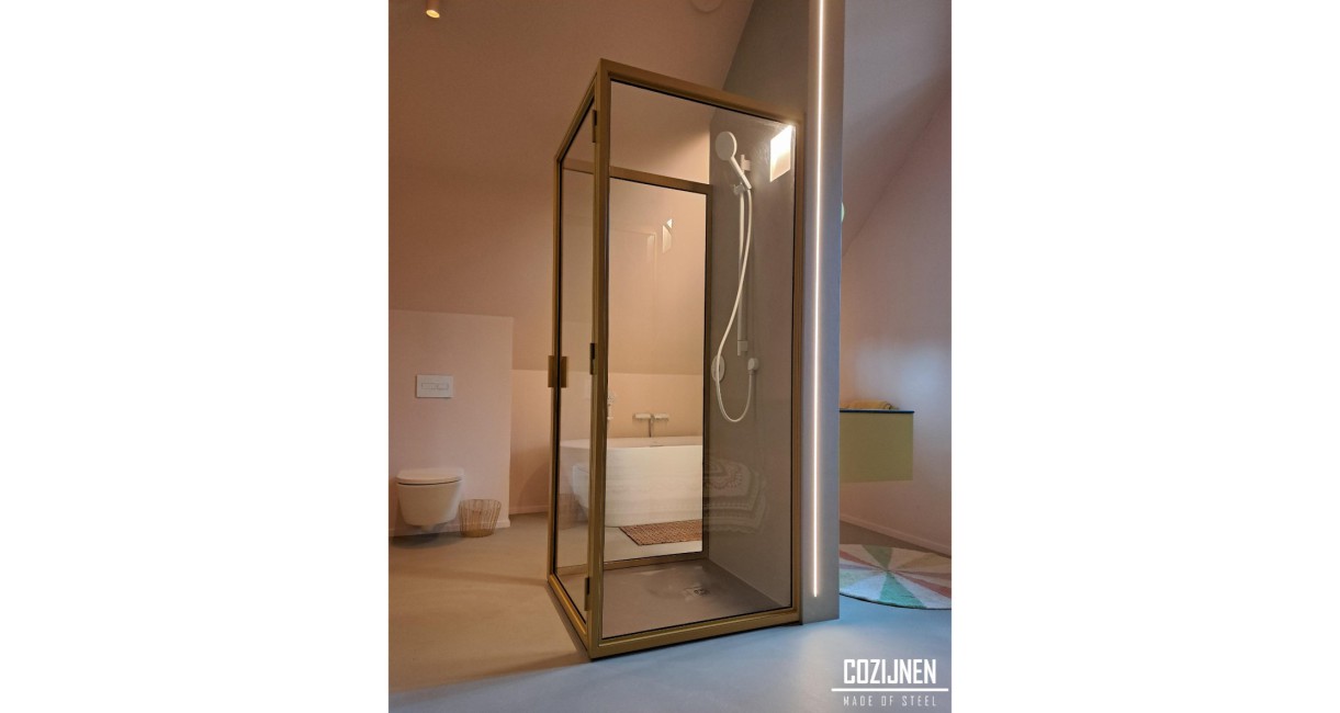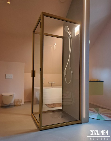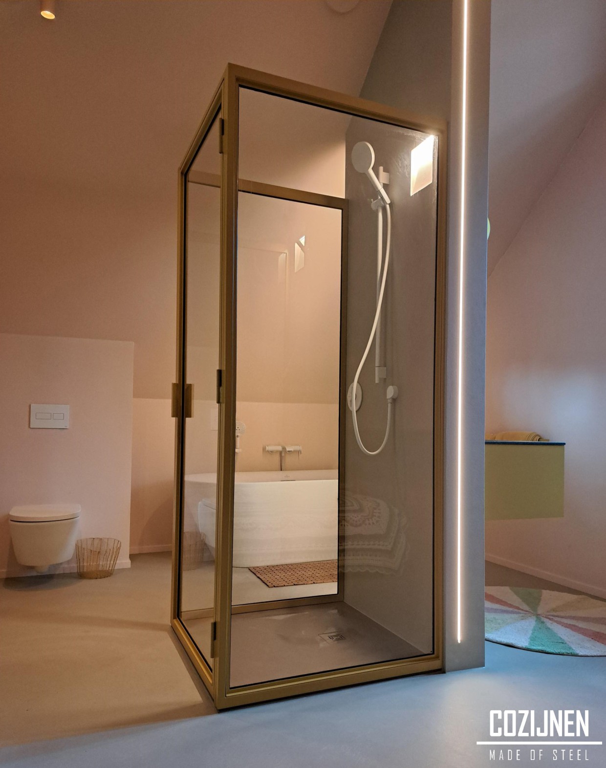 In het gastenverblijf van deze nieuw gebouwde, moderne woning vormt de stalen douchecabine een echte blikvanger. Uitgevoerd in slanke, ranke profielen sluit de cabine naadloos aan op het strakke ontwerp van de badkamer. Het minimalistische karakter zorgt voor rust en ruimte, terwijl het maatwerk garant staat voor een perfecte pasvorm. De keuze voor de okergele kleur is gedurfd, maar pakt verrassend harmonieus uit binnen het geheel. Het resultaat is een douchecabine die niet alleen functioneel is, maar ook karakter en warmte toevoegt aan de ruimte.