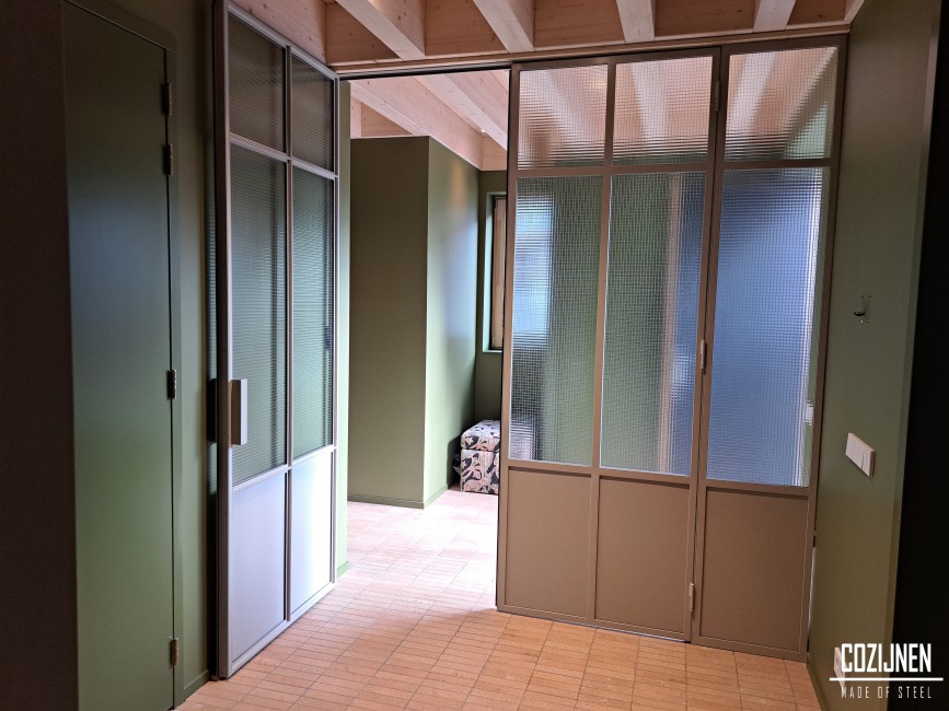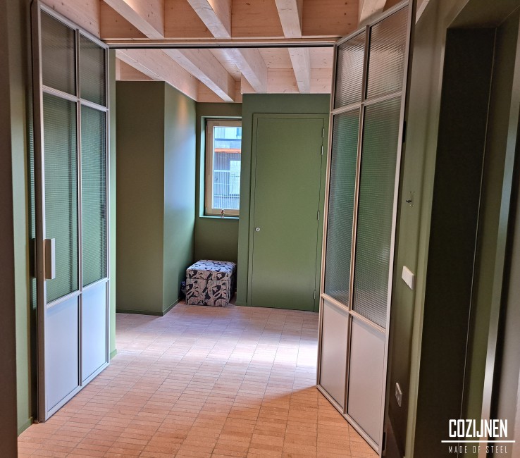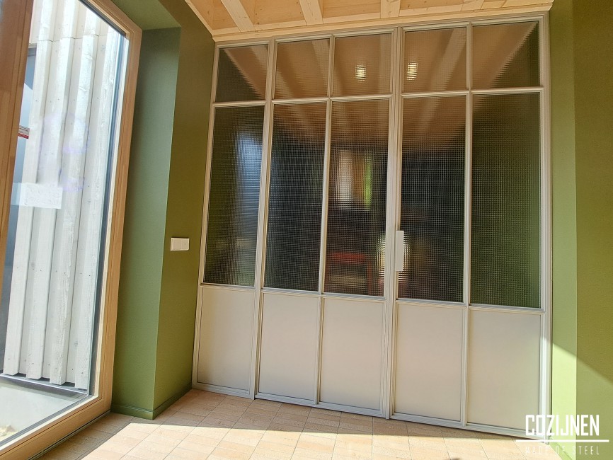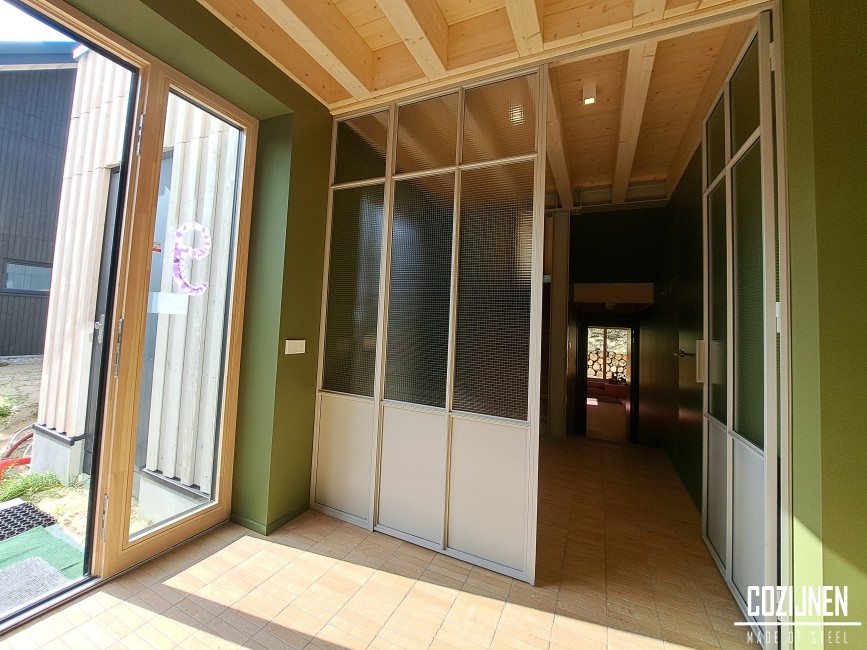 In de entree van deze duinvilla zorgen de dubbele stalen scharnierdeuren met zijlicht voor een indrukwekkende ontvangst. De ranke stalen profielen benadrukken het moderne karakter van de woning, terwijl het draadglas zorgt voor een elegante balans tussen lichtinval en privacy. De stalen schopplaten in de onderste vakken voegen niet alleen een stoer en praktisch detail toe, maar versterken ook het robuuste karakter van het ontwerp. Het resultaat is een entree die stijl, functionaliteit en duurzaamheid verenigt – een passend welkom voor een villa midden in de duinen.