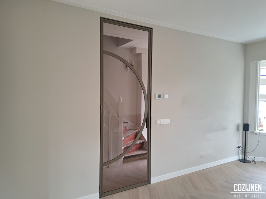 Het gebruik van brons glas zorgt voor een verfijnde balans tussen openheid en privacy. De doorkijk naar de hal wordt op een stijlvolle manier verzacht, terwijl het ruimtelijke gevoel en de lichtinval behouden blijven.