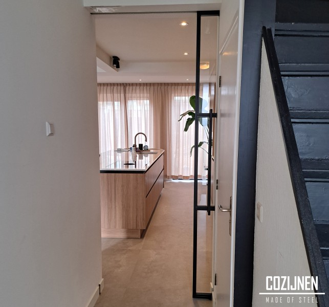 Een stalen schuifdeur tussen de woonkamer en de hal is de perfecte combinatie van functionaliteit en design. Deze deur schuift bij opening volledig weg in de wand, waardoor een royale doorgang ontstaat en de deur volledig uit het zicht verdwijnt. Zo geniet u van een open en ruimtelijk gevoel wanneer u dat wenst, terwijl u de hal eenvoudig kunt afsluiten wanneer dat nodig is.