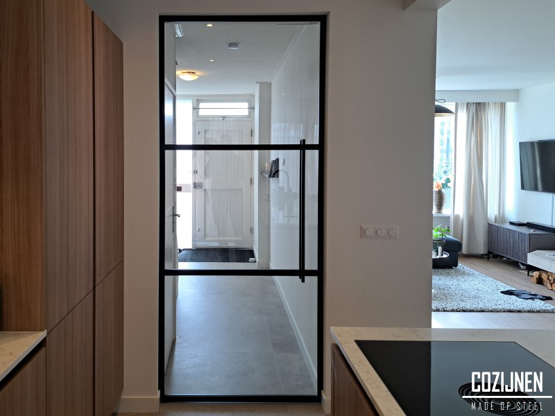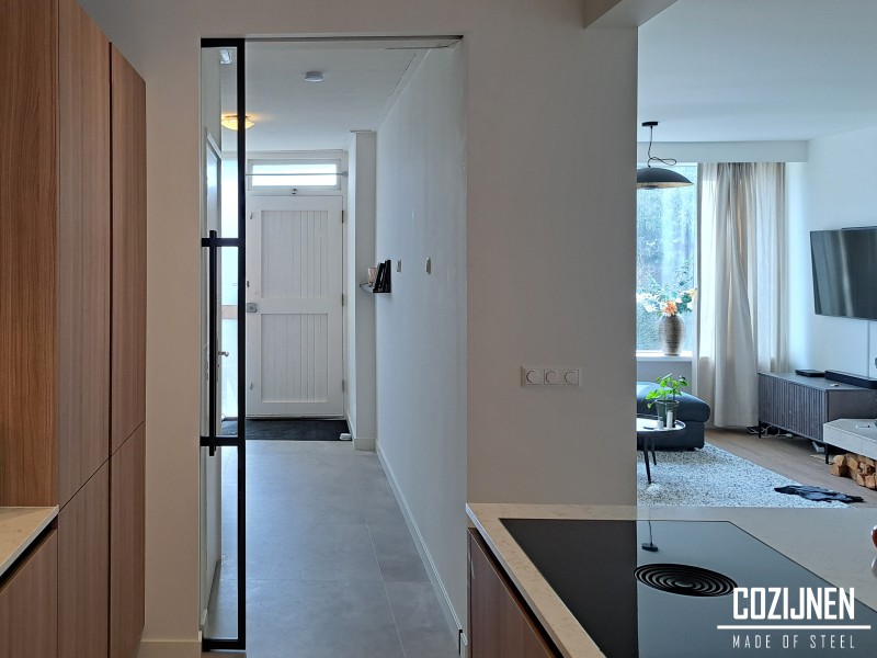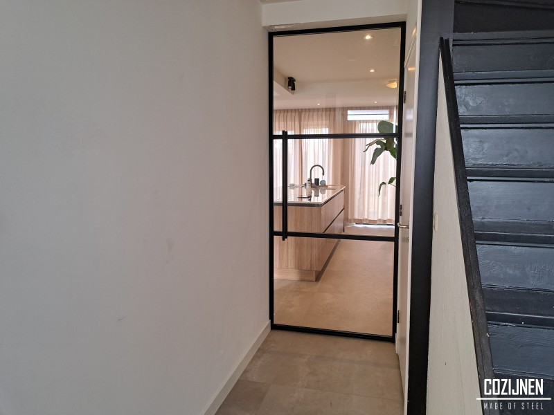 De deur is opgebouwd uit ranke stalen profielen en voorzien van helder glas. Dankzij deze slanke belijning en de transparantie van het glas blijft het interieur licht en luchtig, zelfs wanneer de deur gesloten is. Het daglicht krijgt vrij spel en de zichtlijnen tussen woonkamer en hal blijven behouden.