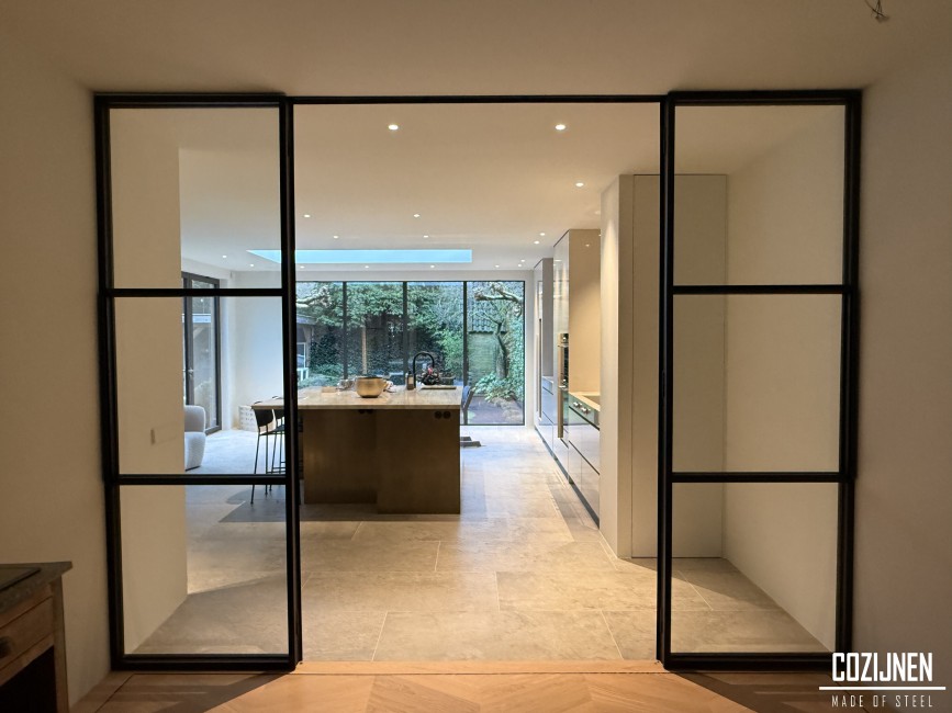 Wanneer gewenst kunnen de schuifdeuren eenvoudig worden gesloten, waardoor de ruimtes effectief van elkaar worden gescheiden. Ideaal wanneer u ongestoord televisie wilt kijken in de zitkamer terwijl er in de keuken wordt gekookt of geleefd. Zo combineert deze stalen roomdivider esthetiek met comfort en functionaliteit in één elegant geheel.
