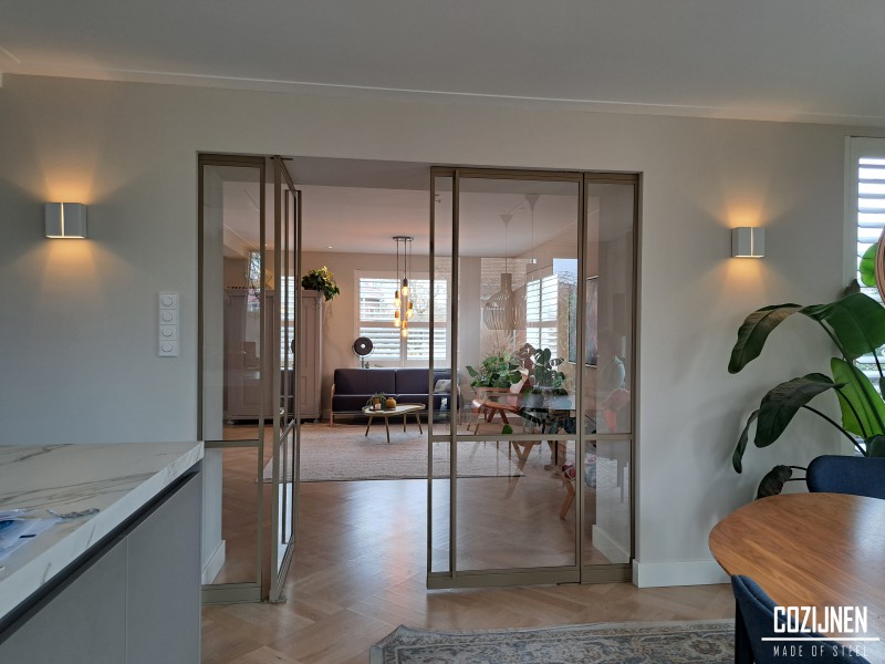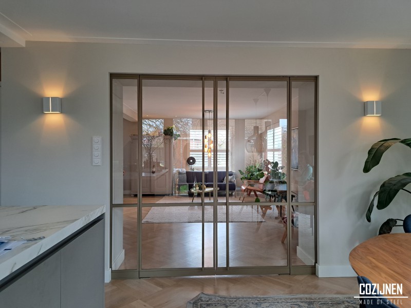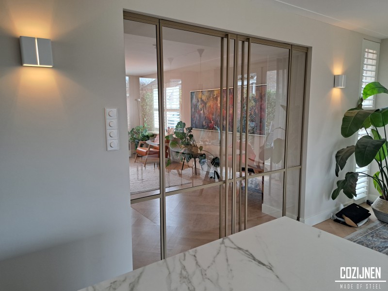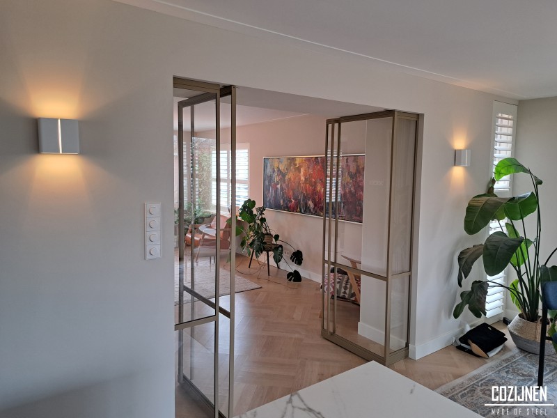 De licht bronze poedercoating geeft de deuren een warme en elegante uitstraling die perfect aansluit bij het interieur. De subtiele kleur voegt karakter toe zonder te overheersen en vormt een harmonieus geheel met zowel moderne als natuurlijke materialen.