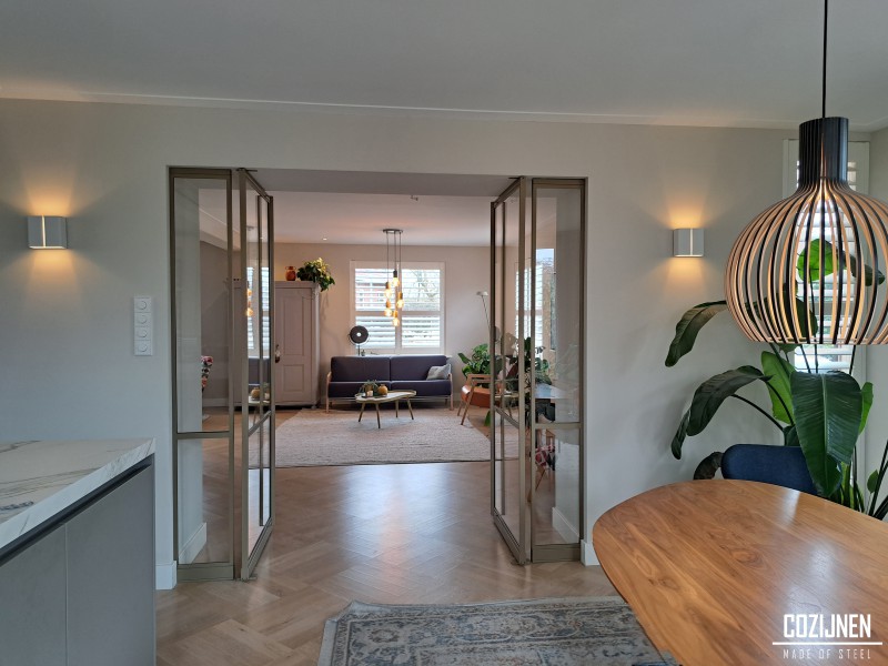 Dubbele stalen taatsdeuren met zijlicht vormen een stijlvolle verbinding tussen de woonkamer en de keuken. Dankzij de extra ranke stalen profielen ontstaat een bijzonder slank en verfijnd geheel, waarbij licht en ruimte centraal staan. De grote glasvlakken zorgen ervoor dat beide ruimtes visueel met elkaar verbonden blijven, terwijl de deuren toch de mogelijkheid bieden om ze van elkaar te scheiden.