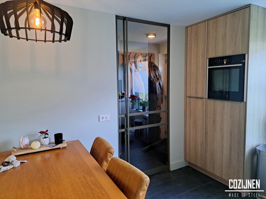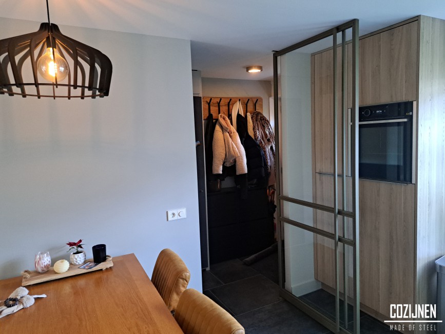 Een stalen taatsdeur tussen de woonkamer en de hal vormt een subtiele maar krachtige verbinding tussen beide ruimtes. Dankzij de slanke profielen behoudt de entree een open en ruimtelijk karakter, terwijl het daglicht vrij spel krijgt en de hal zichtbaar wordt verrijkt met extra lichtinval. De afwerking in de kleur Earth Clay geeft de deur een warme, tijdloze uitstraling die perfect aansluit bij zowel moderne als natuurlijke interieurs. Een functionele eyecatcher die rust, licht en elegantie samenbrengt.