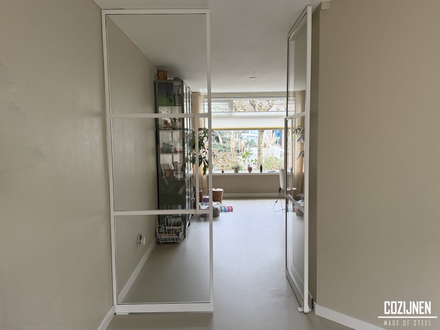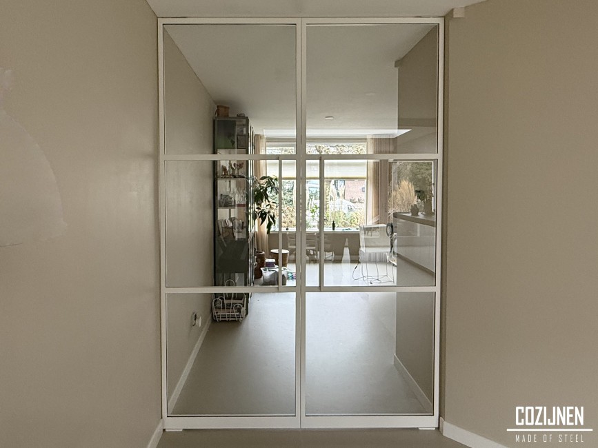 De dubbele stalen taatsdeuren vormen een elegante scheiding tussen de voorkamer en de keuken. Door de slanke profielen en de witte, gladde poedercoating hebben de deuren een lichte en strakke uitstraling die naadloos aansluit bij het moderne interieur. Het minimalistische ontwerp zorgt voor rust en ruimtelijkheid, terwijl het staal juist karakter en kwaliteit toevoegt.