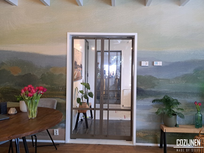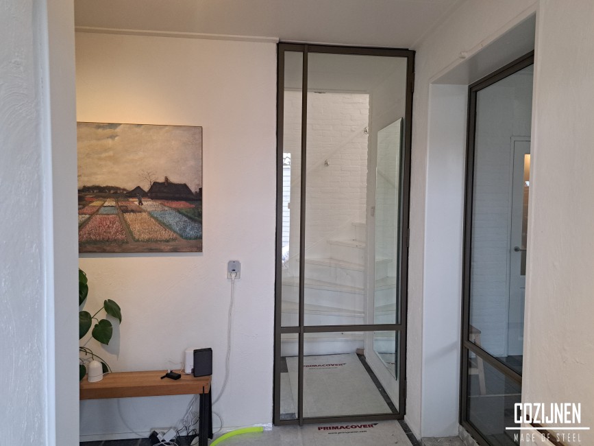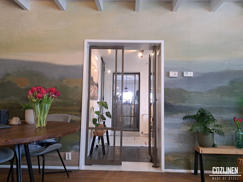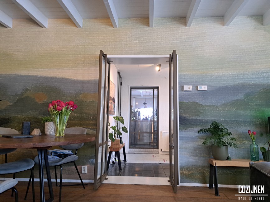 Deze stalen deuren vormen een elegante schakel tussen de entree en de overige vertrekken. Ze sluiten de doorgangen op een subtiele en stijlvolle manier af, zonder het open en ruimtelijke karakter van de woning te verliezen. Dankzij het gebruik van slanke profielen en royale glasvlakken blijft het zicht intact en wordt het daglicht moeiteloos door de ruimtes geleid.