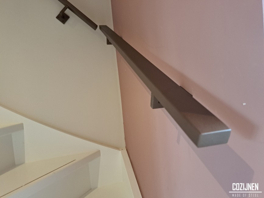 Breng rust, warmte en eenheid in uw interieur met een stijlvolle combinatie van een stalen taatsdeur en bijpassende trapleuningen. De taatsdeur, geplaatst tussen de woonkamer en de hal, is vervaardigd uit slanke stalen profielen en afgewerkt in een elegante bronze poedercoat kleur. Deze warme tint komt subtiel terug in de stalen trapleuningen, waardoor er een prachtig samenhangend geheel ontstaat.