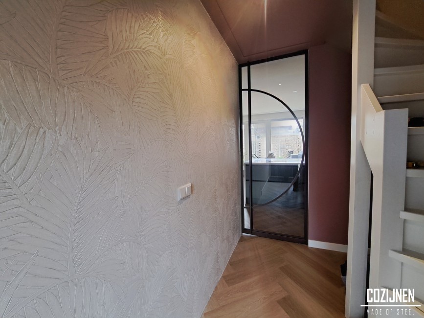 Het gebruik van brons gekleurd glas in de deur zorgt voor een verfijnde balans tussen openheid en privacy. Het licht kan vrij door de ruimtes blijven stromen, terwijl de doorkijk op een subtiele manier wordt verzacht. Dit maakt de deur niet alleen een functioneel element, maar ook een echte sfeermaker binnen het interieur.