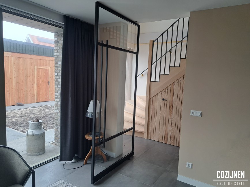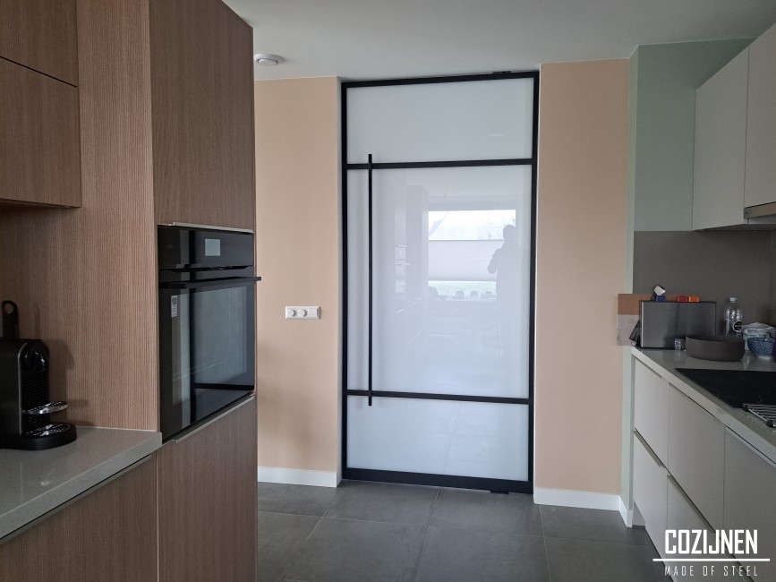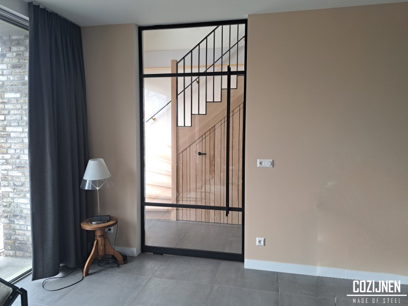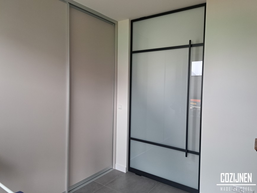 In twee van de deuren is melkglas toegepast. Dit haalt het zicht vanuit en naar de hal weg, zonder het ontwerp te doorbreken. De combinatie van rank staal en diffuus glas zorgt voor privacy, terwijl de esthetische lijn volledig behouden blijft. Het resultaat is een stijlvolle en coherente oplossing die zowel functioneel als architectonisch sterk is.