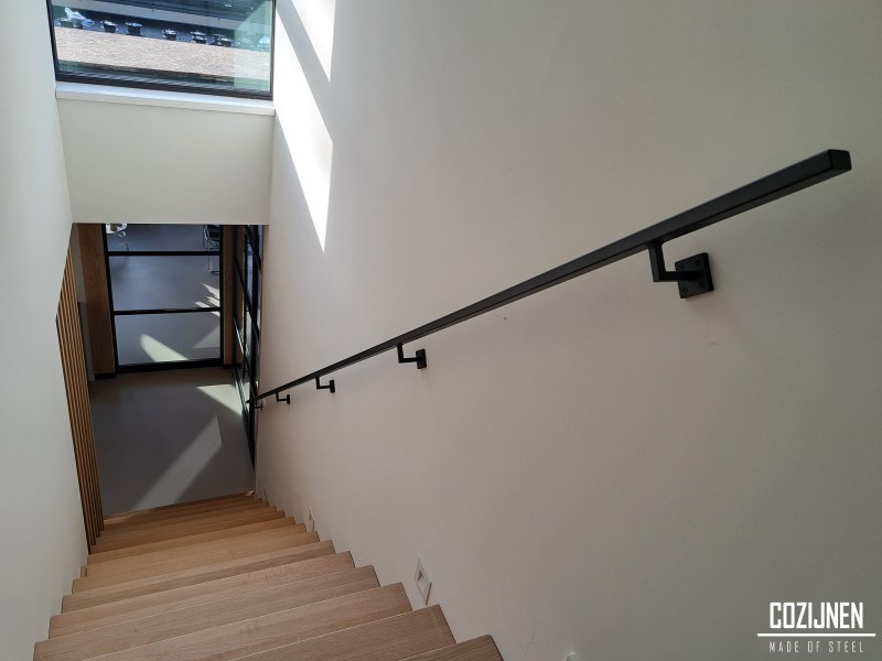 De stalen trapleuning is slank en subtiel vormgegeven en vormt een stijlvolle aanvulling op het interieur. Door de afwerking in dezelfde poedercoating als de stalen deuren ontstaat er een mooi, rustig geheel met een uniforme uitstraling. Naast het verfijnde ontwerp is de leuning ook een stevige en veilige toevoeging aan de woning. Zo worden functionaliteit en esthetiek op een natuurlijke manier met elkaar gecombineerd.