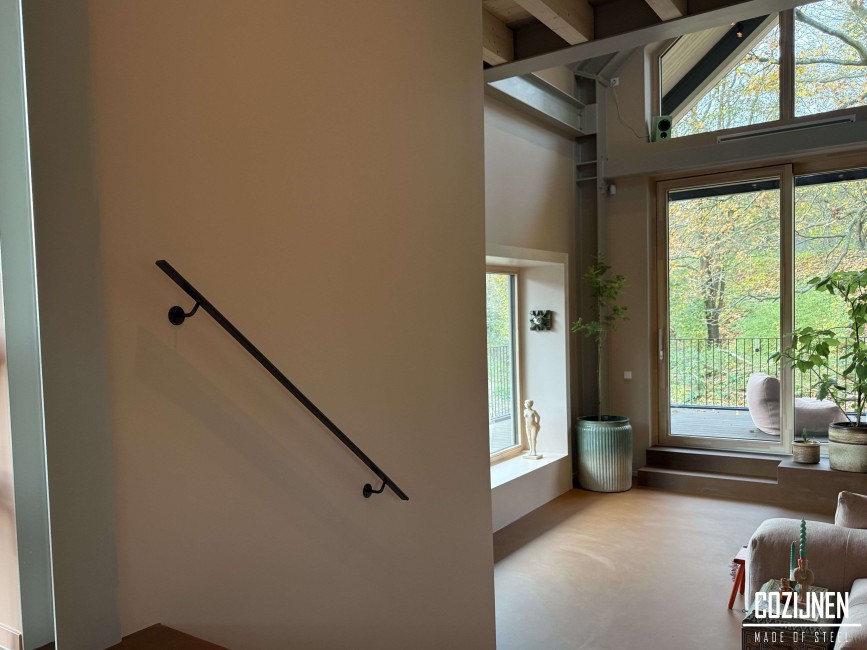 De leuningen zijn uitgevoerd in staal en combineren een stoere, robuuste uitstraling met een minimalistisch ontwerp. Geen overbodige details, maar een krachtig en eerlijk product dat rust brengt in het geheel. Juist door hun eenvoud laten ze de architectuur en het interieur voor zich spreken.